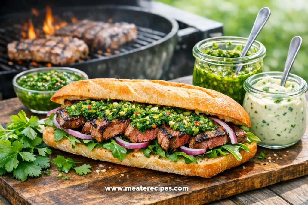 You can spoon chimichurri directly onto your steak sandwich for a lighter, oil-based dressing, or you can stir some into mayonnaise to create a chimichurri mayo that feels more like a spread. Either way, the combination of herbs, acidity, and a bit of heat adds energy and freshness to each bite of your sandwich.