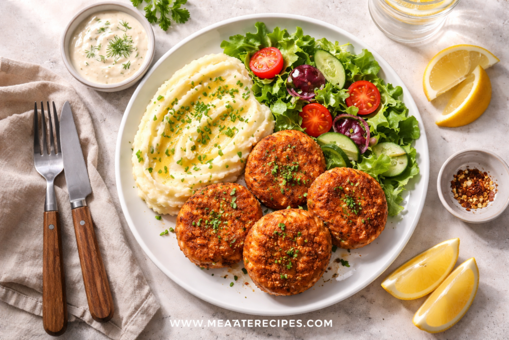 Once you master how to make salmon croquettes step by step, you can build many different plates around them. For a Southern-style meal, you might serve them over creamy grits or alongside coleslaw and cornbread. For a more everyday dinner, potatoes, rice, or a simple green salad work beautifully